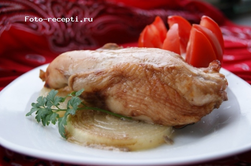 Отправляем в духовку, обязательно хорошо прогретую градусов до 200, иначе грудки потеряют сок и будут суховатыми. Жарим в духовке 30 минут. Минут через 15, когда грудки "схватятся", то есть немного обжарятся снаружи, их можно периодичеки поливать маринадом, но смотрите, чтобы маринад на противне был не выше уровня лука.